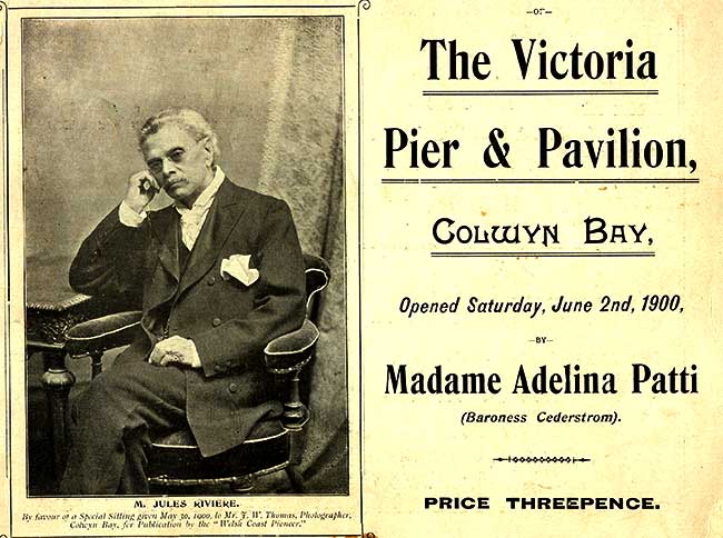 my-musical-life-and-recollections_jules_prudence_riviere_4The lure of the new Victoria Pier in Colwyn Bay proved irresistible and in 1890 Jules Prudence Riviere and his orchestra were secured to perform for the opening season. At the official opening on June 2nd 1890 Riviere orchestrated a phenomenal concert which featured the critically acclaimed Madame Adelina Maria Clorinda Patti.